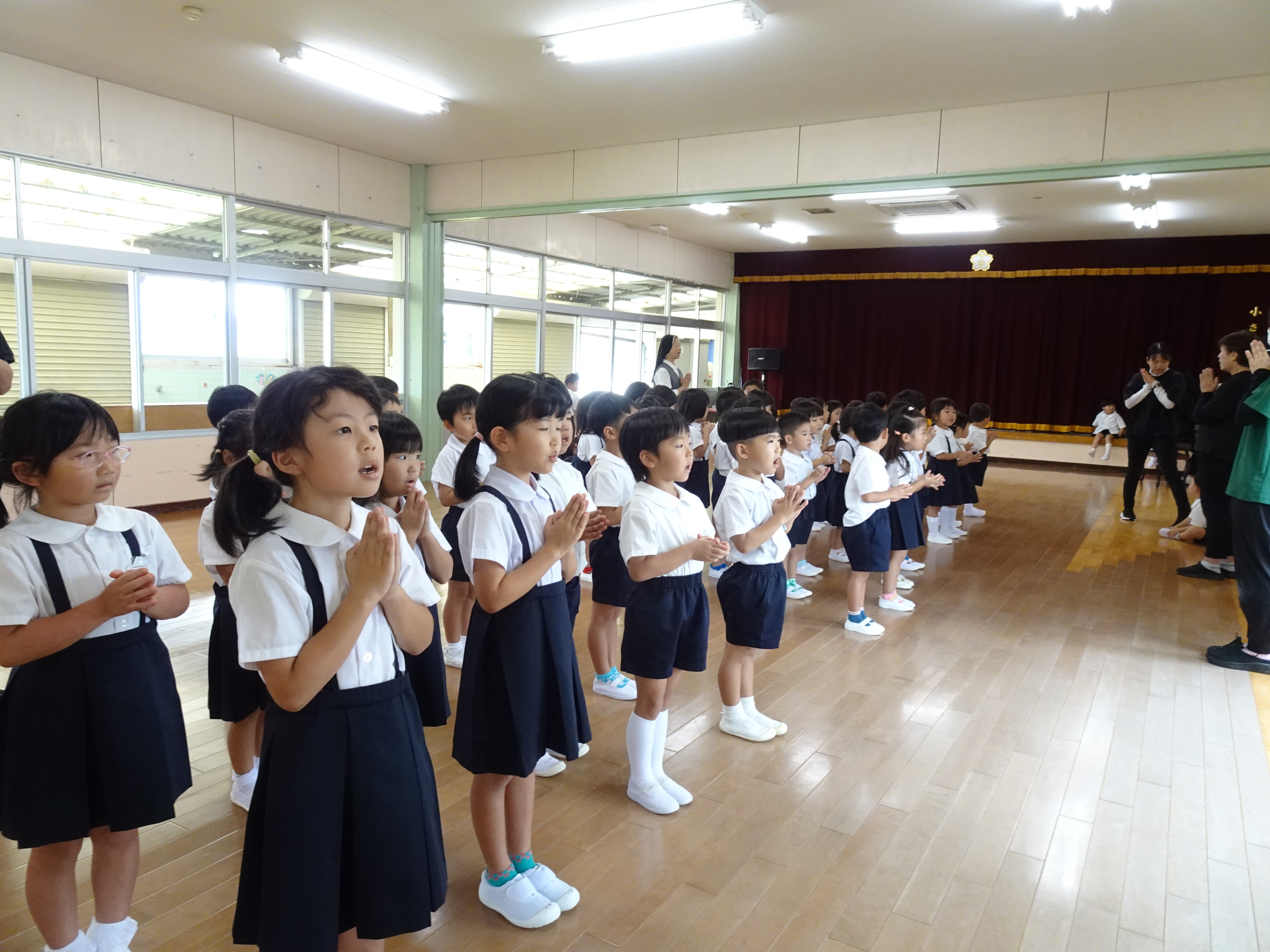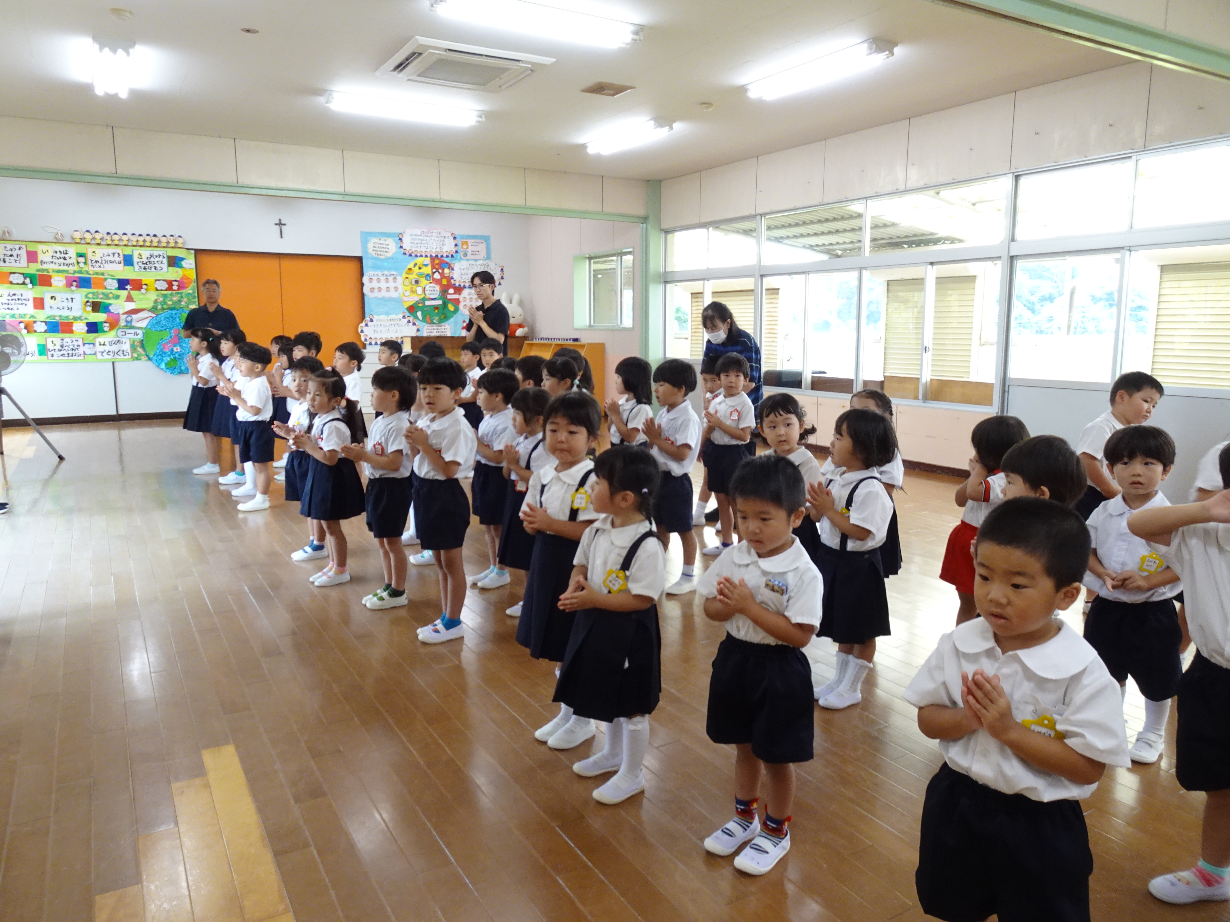 始業式では園長先生より「運動会やクリスマス会など色々な行事をご家族の皆さんにプレゼントする気持ちで、みんなで力を合わせてがんばりましょう」とお話ししていただきました。
