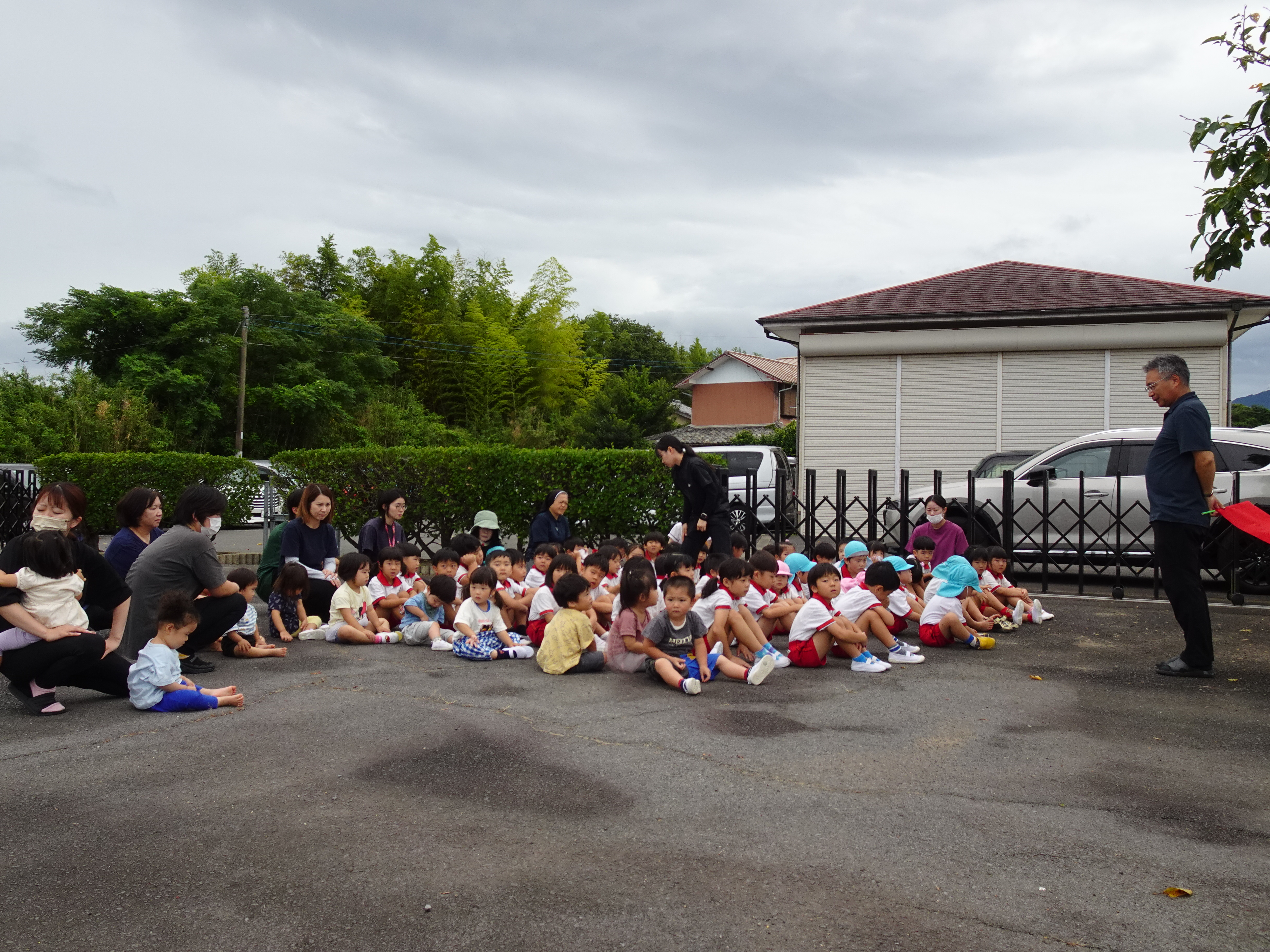 今月の避難訓練は「火災発生」を想定して行いました。子どもたちは放送をしっかりと聞き、口と鼻にハンカチなどをあてながら、落ち着いて避難することができました。実際の災害時にも落ち着いて行動できるよう、今後も日々の訓練を大切にしていきたいと思います。