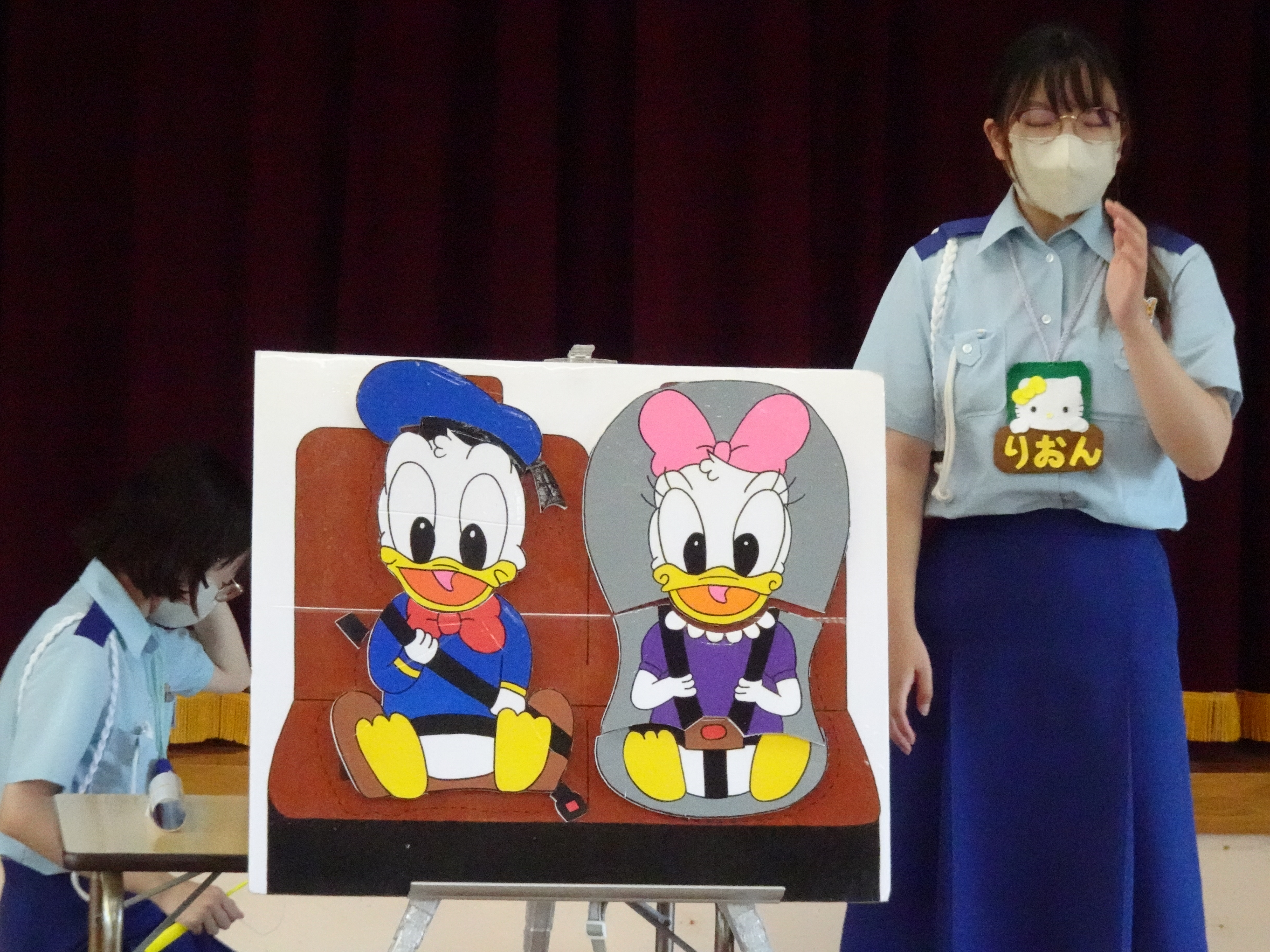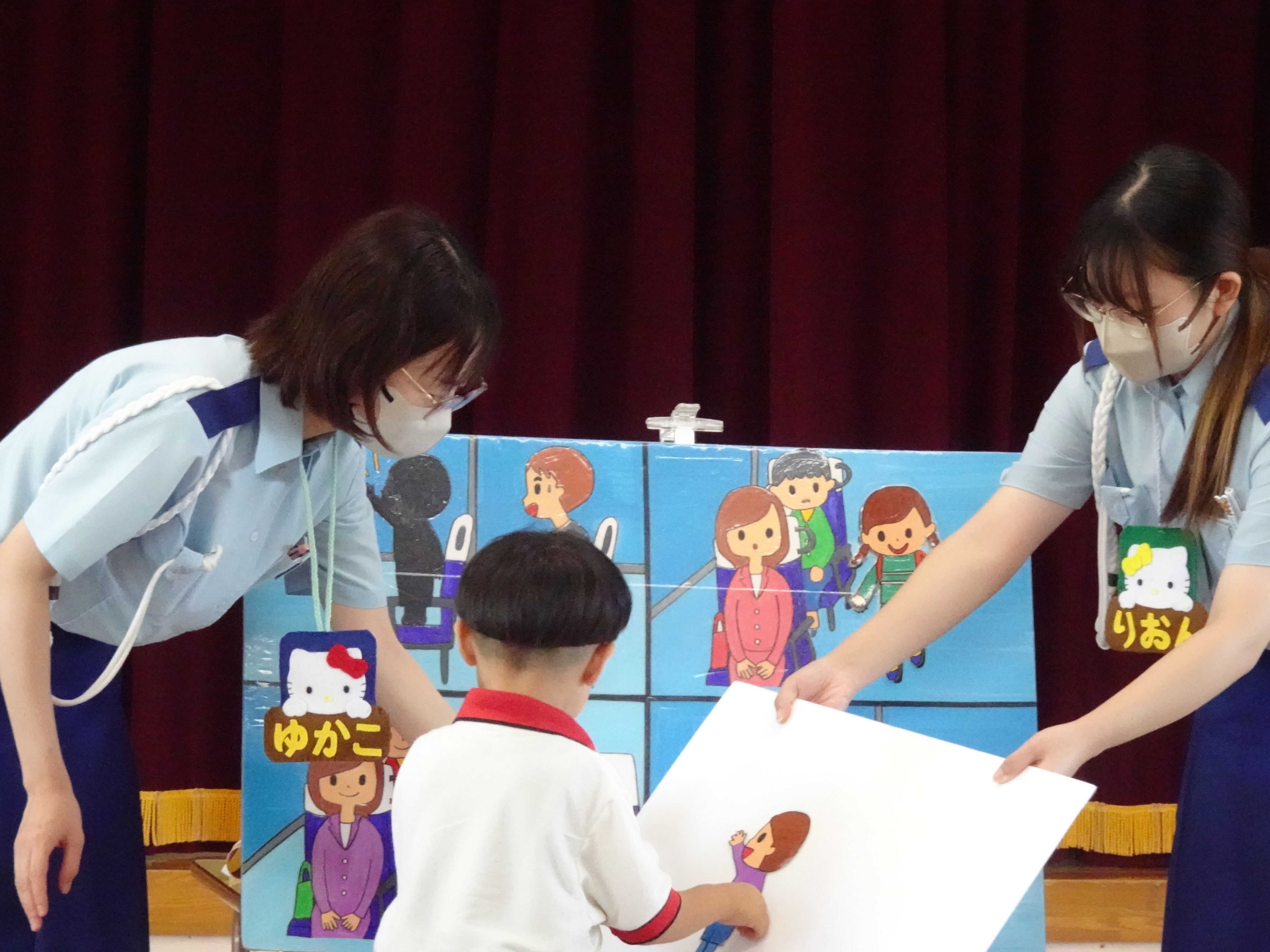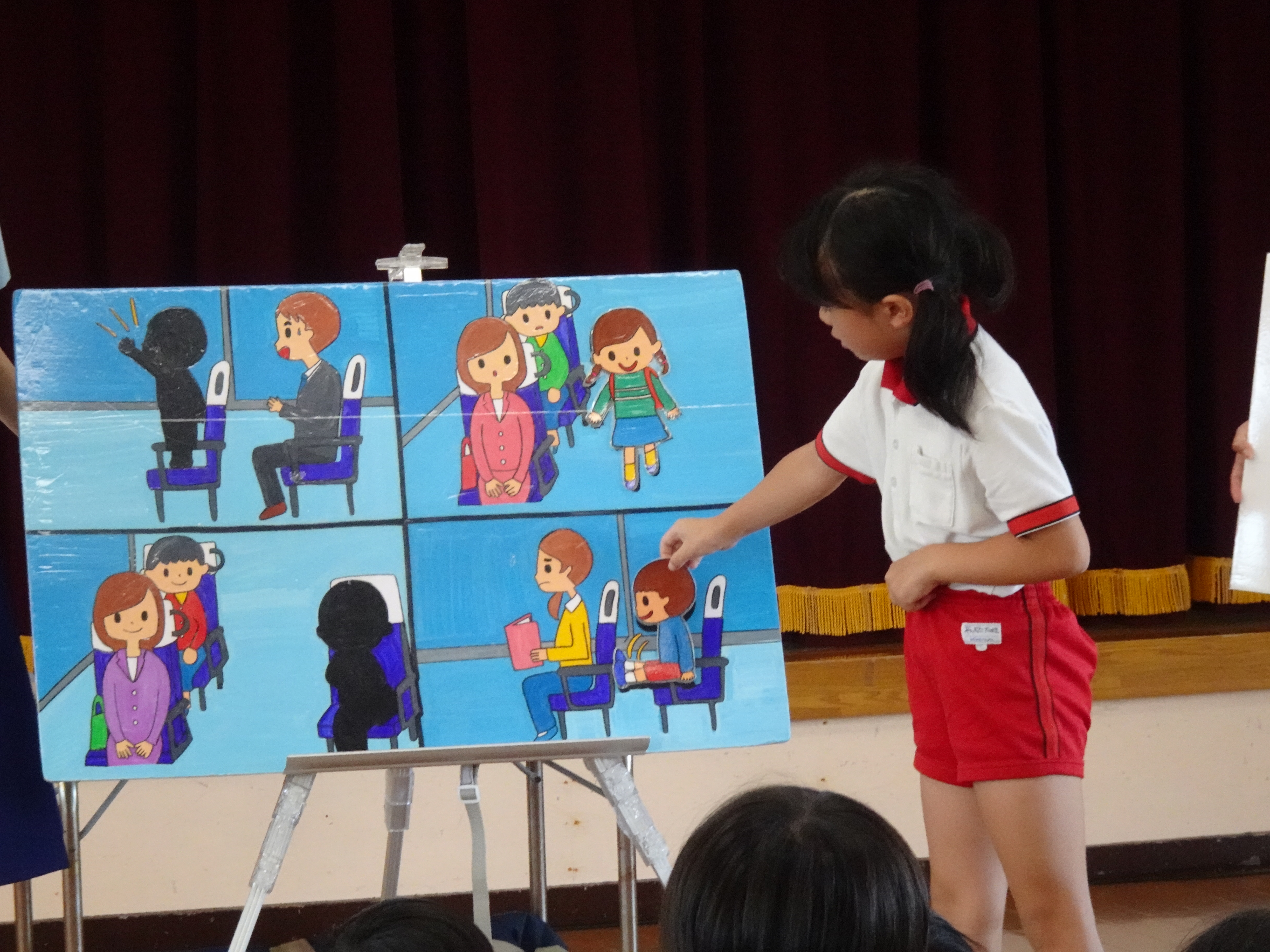 今月の交通安全教室では、バスに乗る時の安全な過ごし方とチャイルドシートやジュニアシートの大切さについて、イラストのパズルをはめ込み楽しく学びました。