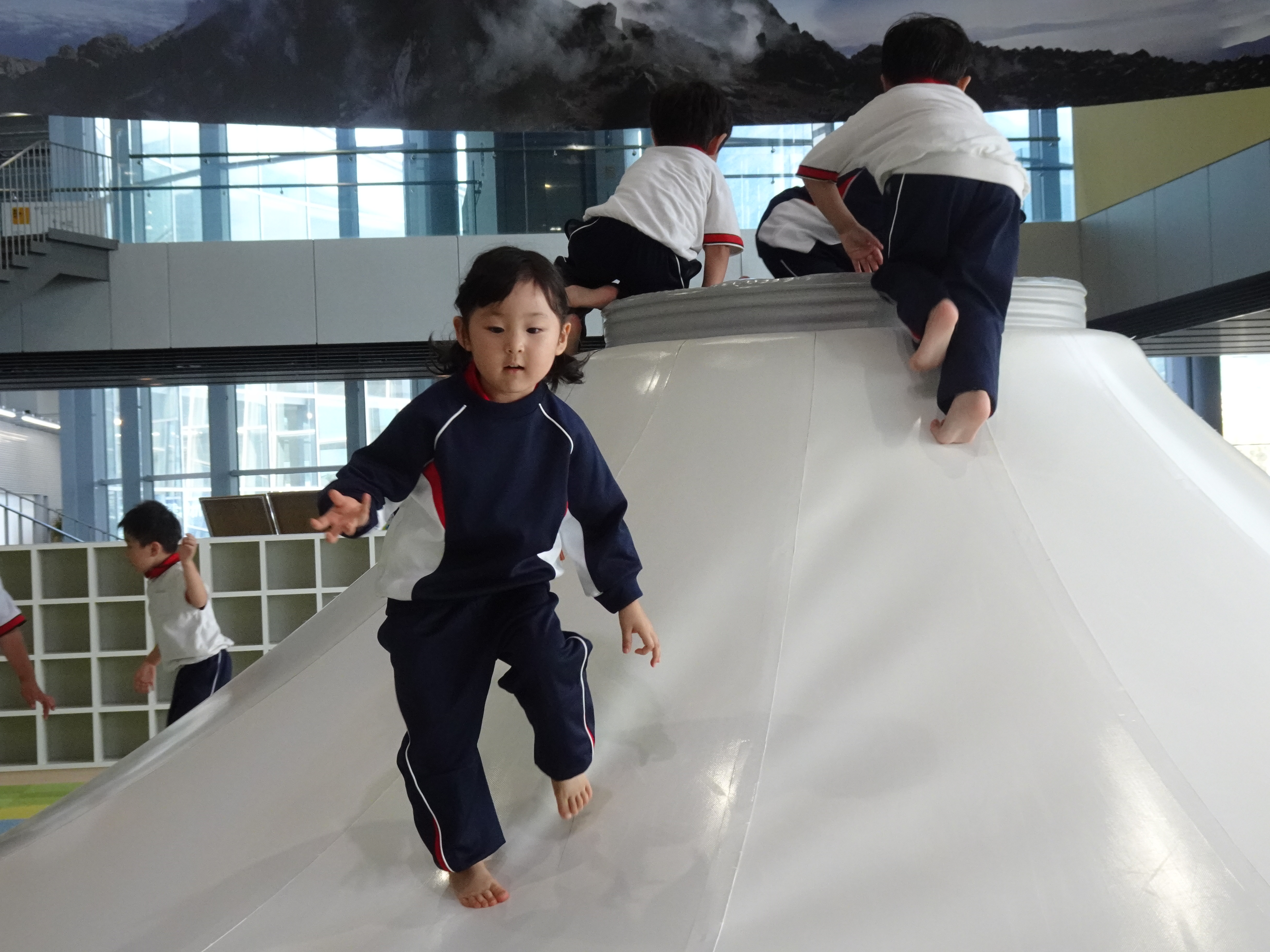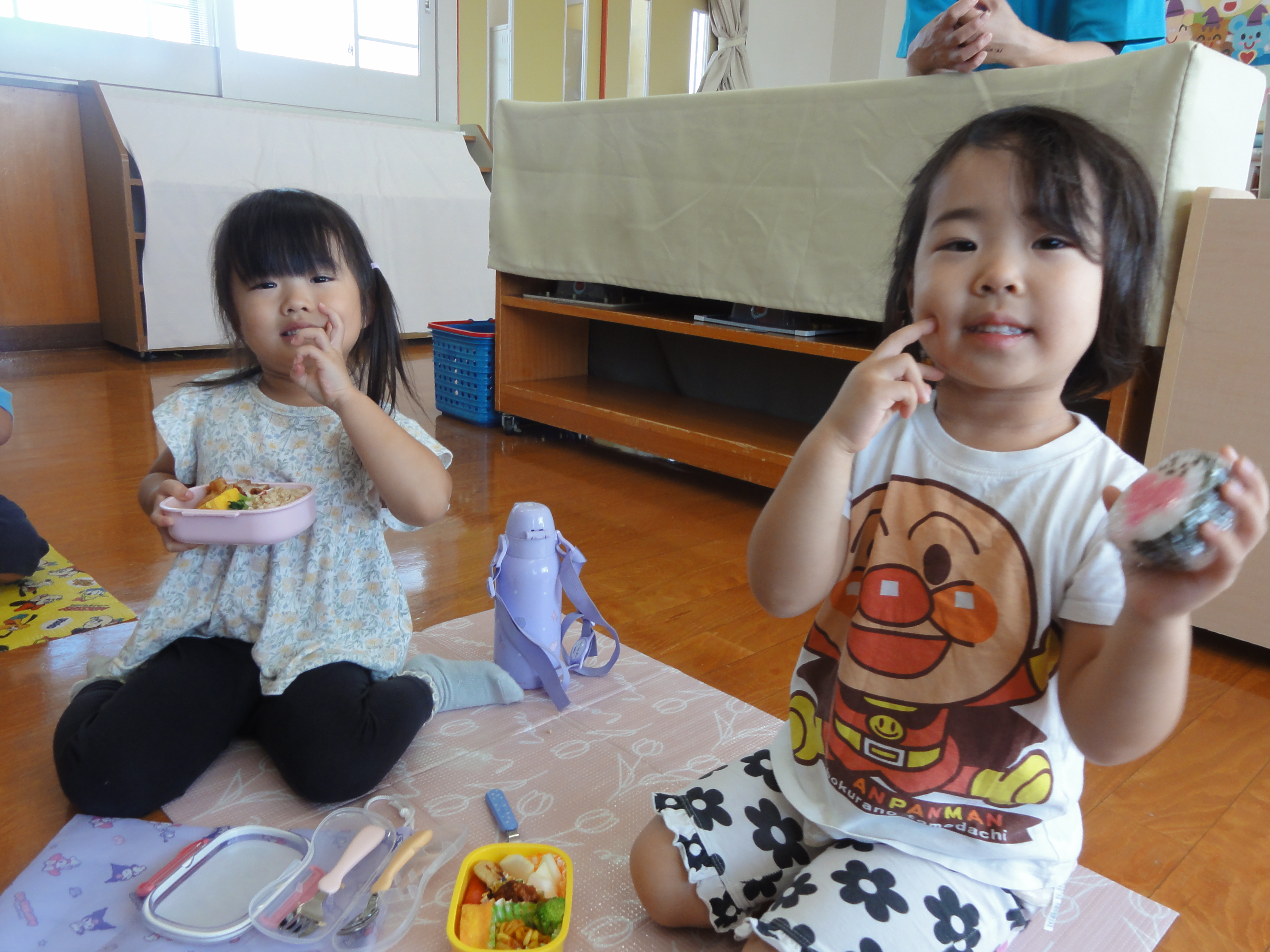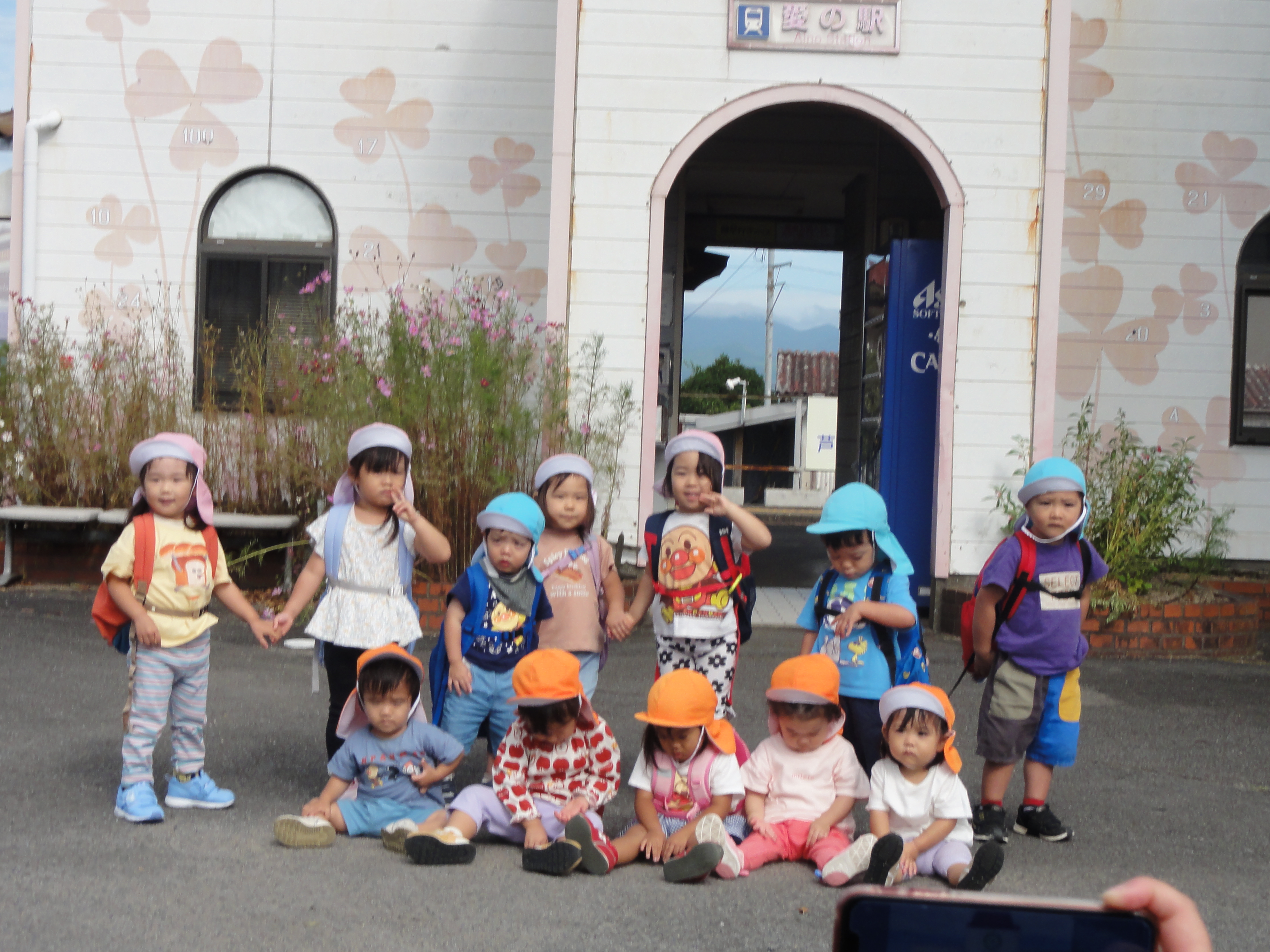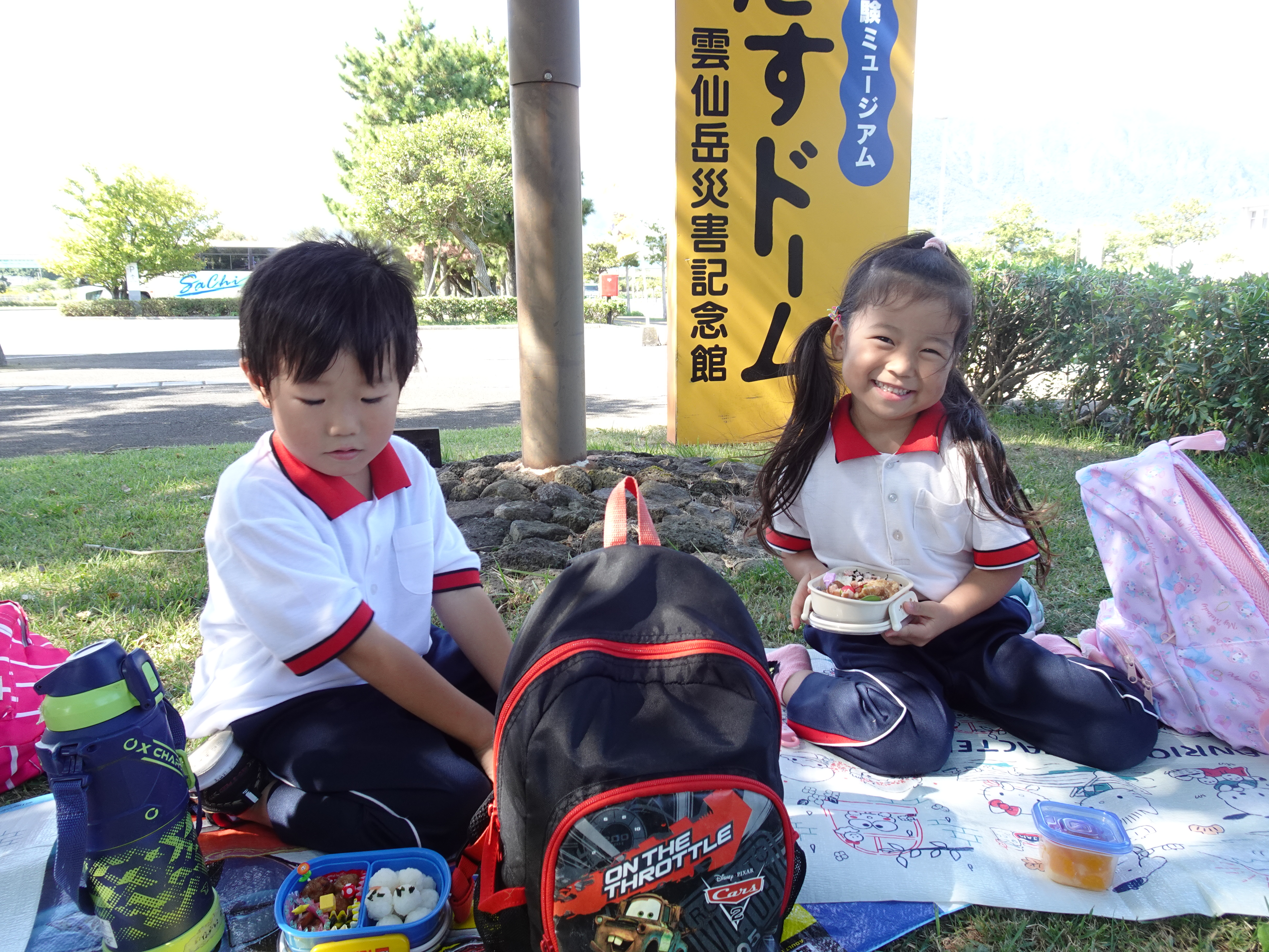 以上児は観光バスに乗ってがまだすドームに行きました。年長児と年中児はがまだすドームで噴火についての紙芝居を見て、災害の恐ろしさを学びました。その後みんなで施設内の遊具でたくさんあそび、近隣を散歩しマツボックリを拾って楽しみました。未満児は愛野駅まで電車を見に行き、園内でシートを広げてお弁当を食べたりおやつを食べ、遠足気分を楽しみました。以上児も未満児も、お父さんお母さんの手作り弁当に歓声をあげながら感謝のうちに頂きました。天気にも恵まれ、楽しい一日となりました。