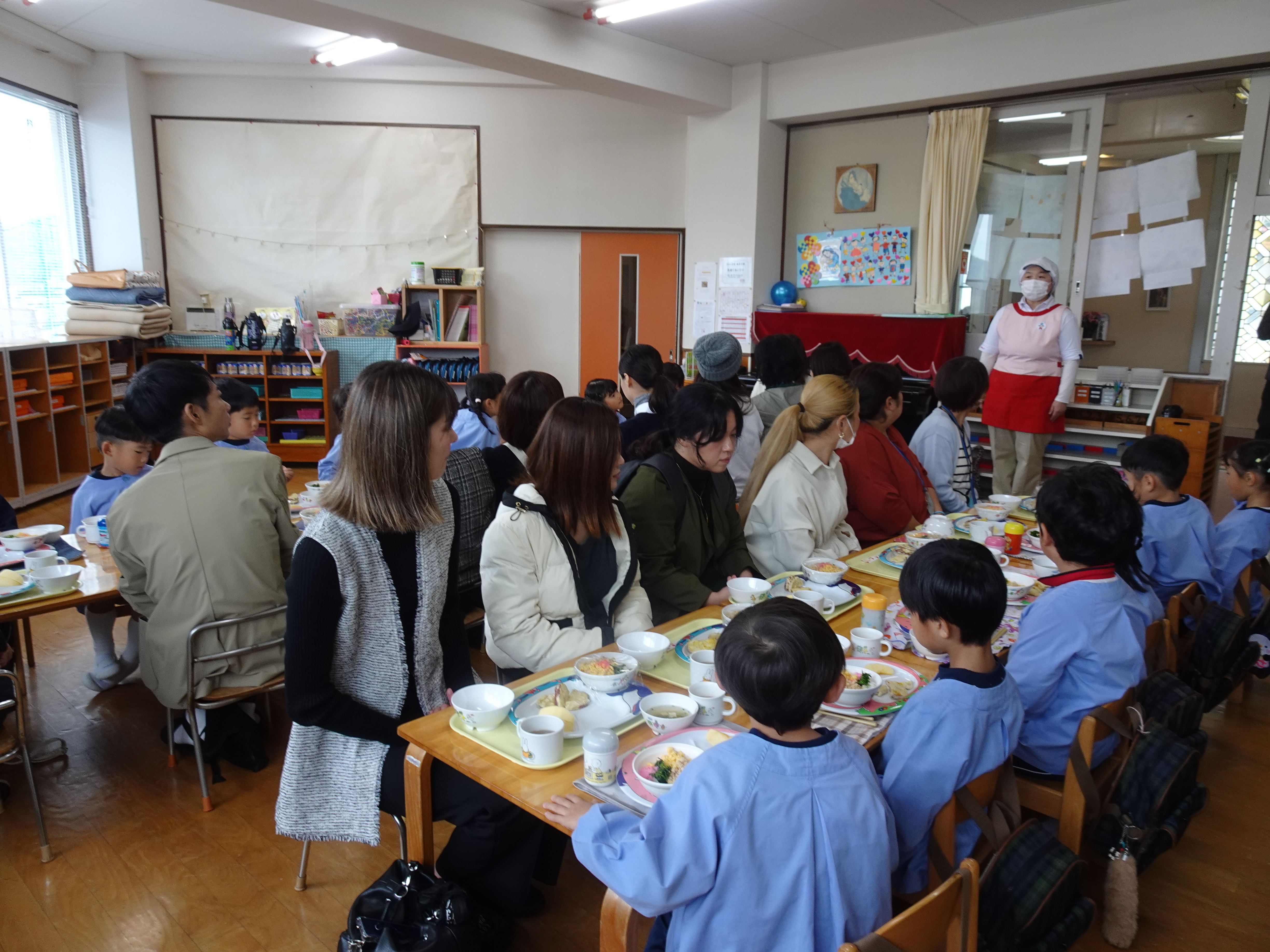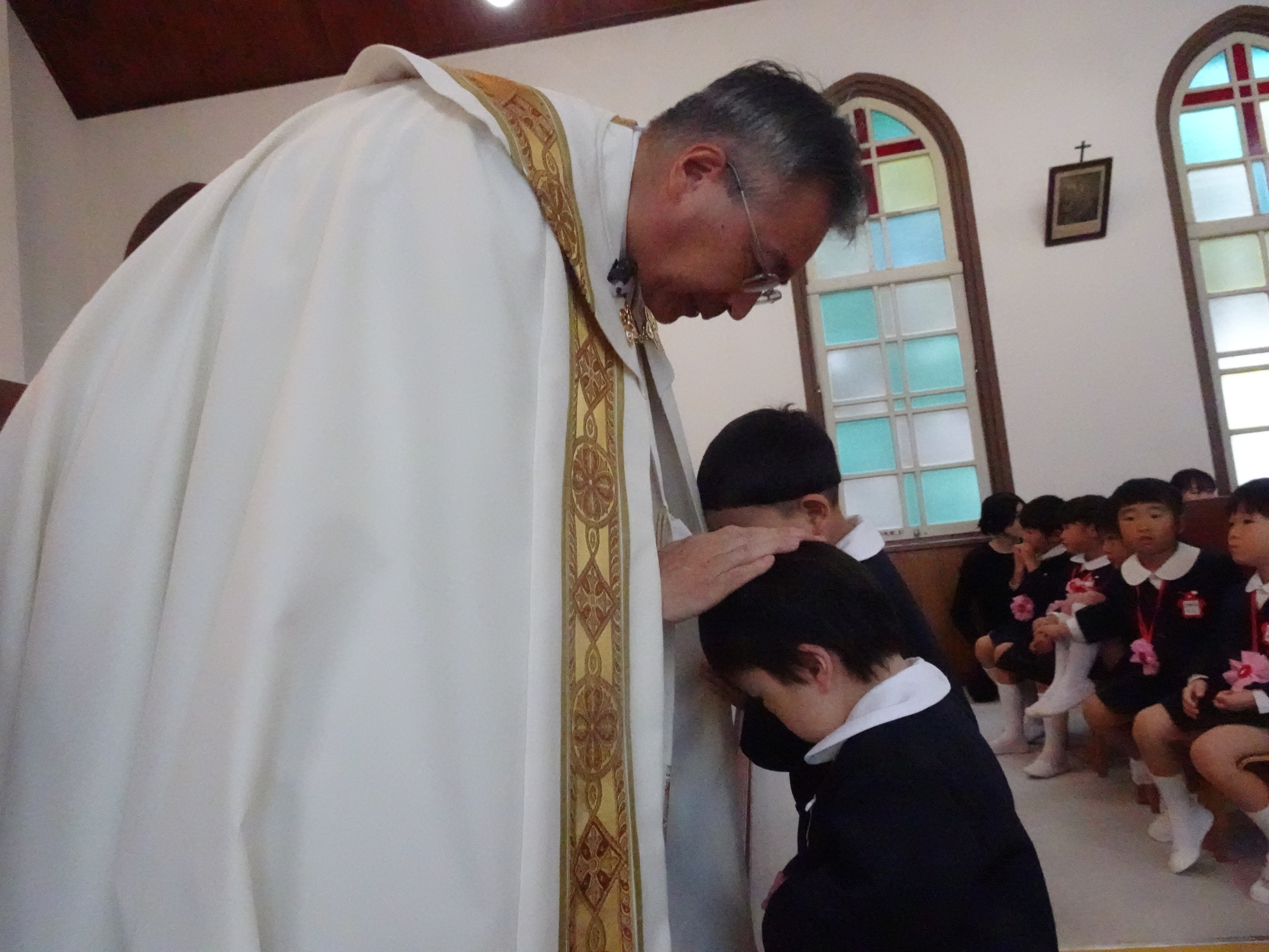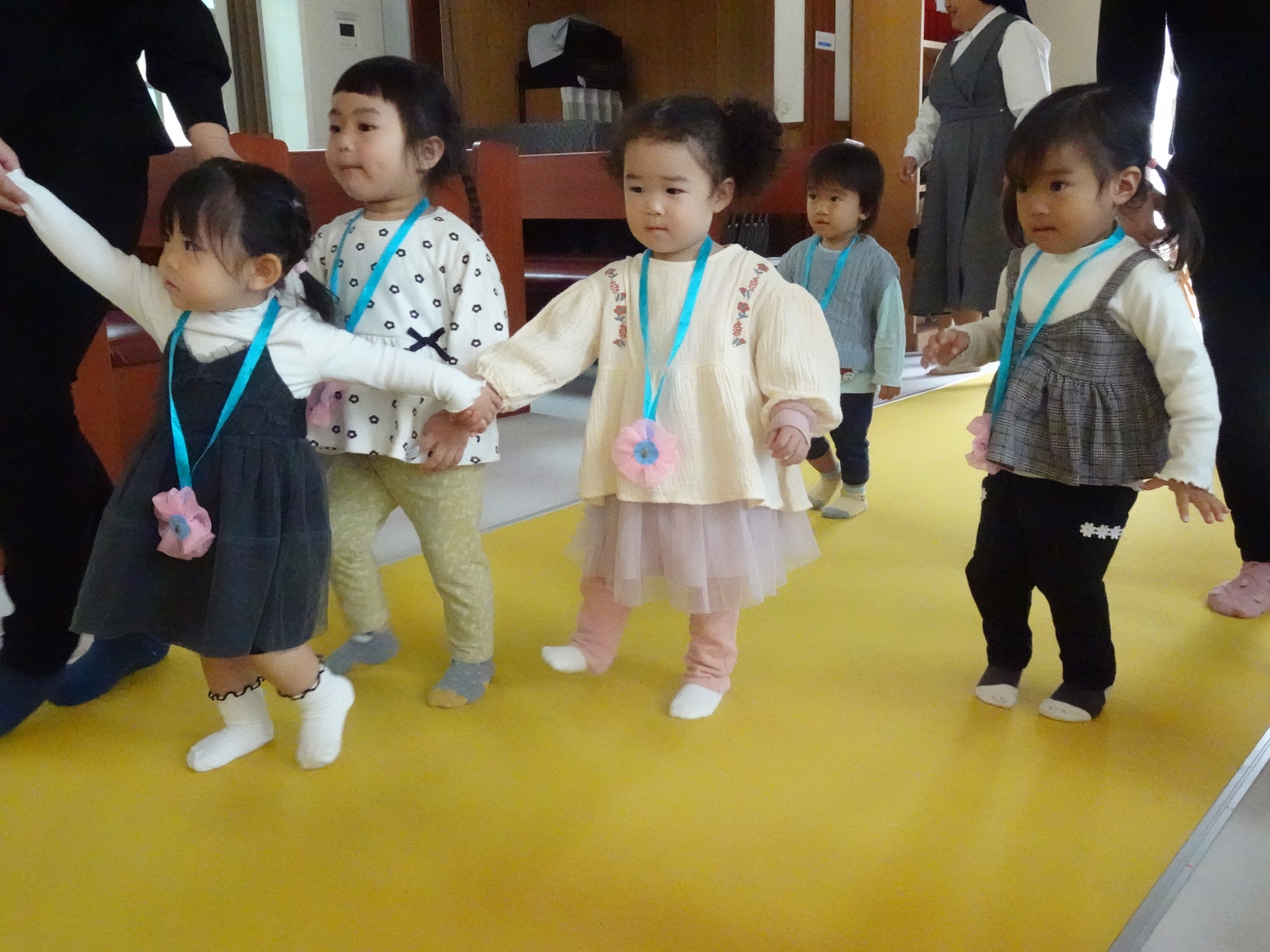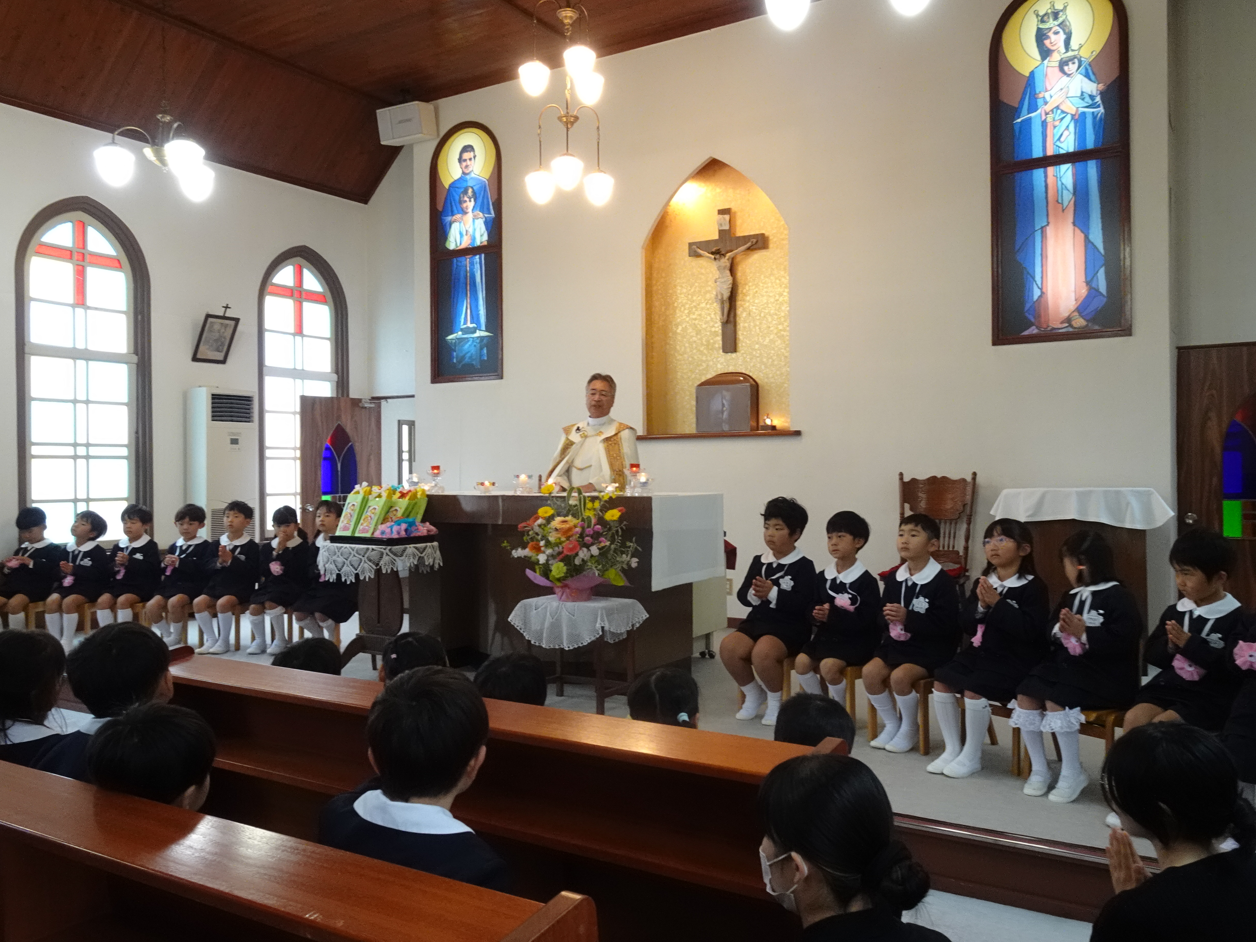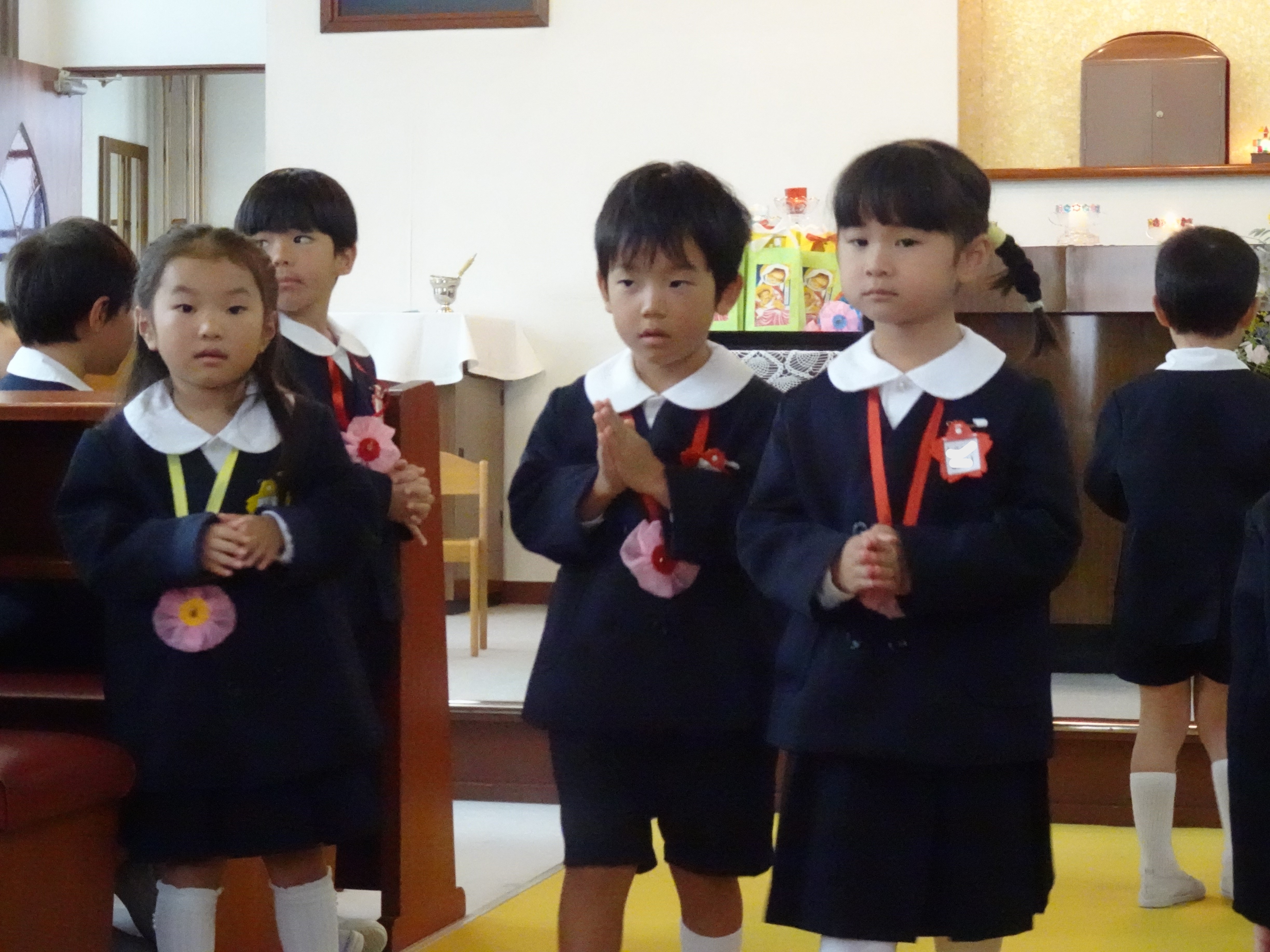 今日は七五三祝福式が行われました。教会に入堂する際、子どもたちは園長先生より按手していただきました。式では「一人ひとりが元気で健やかに育ちますように」「家族みんなが幸せに暮らせますように」と園長先生のお話を聞き、周りの方々に感謝の気持ちを込めてお祈りしました。式後、年長児は保護者を対象に給食試食会を行い、ご家族の方と一緒に給食を食べることが出来てとても嬉しそうでした。
