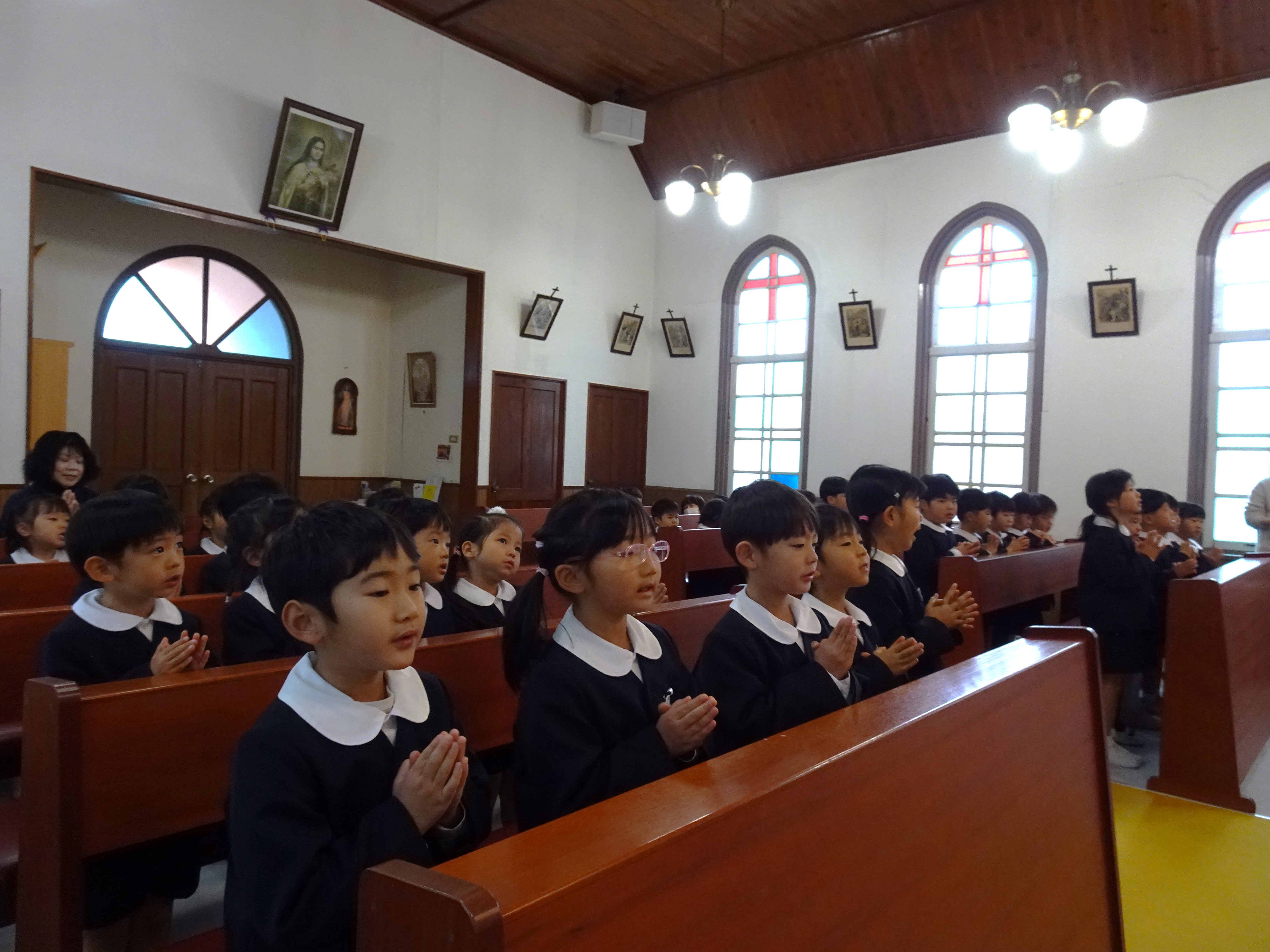 3学期がスタートしました。久しぶりに制服を着て登園し、先生やお友だちとの再会を喜び、新年のご挨拶を交わしました。教会での始業式では園長先生より「3学期も楽しく過ごしましょう、そして『自分でできることをしなさい。自分にできないことは神様がしてくださいます』というドン・ボスコのお言葉を大切に、自分でできることを少しずつ頑張りましょうね」とお話がありました。今学期も、子どもたちの笑顔や笑い声に包まれながら、季節の行事や新年度に向けてできることを一歩一歩取り組み、毎日楽しく過ごしていきたいと思います。