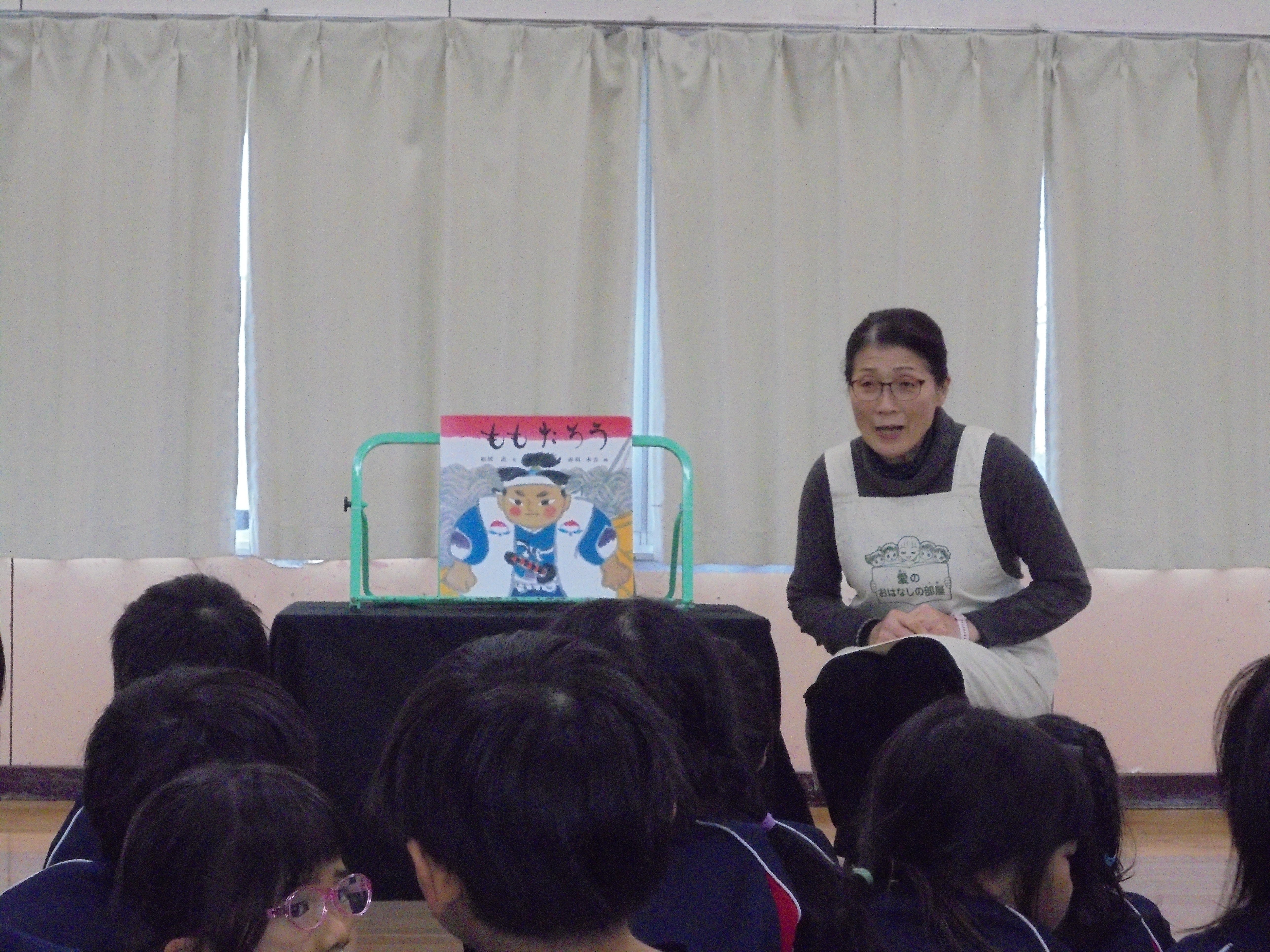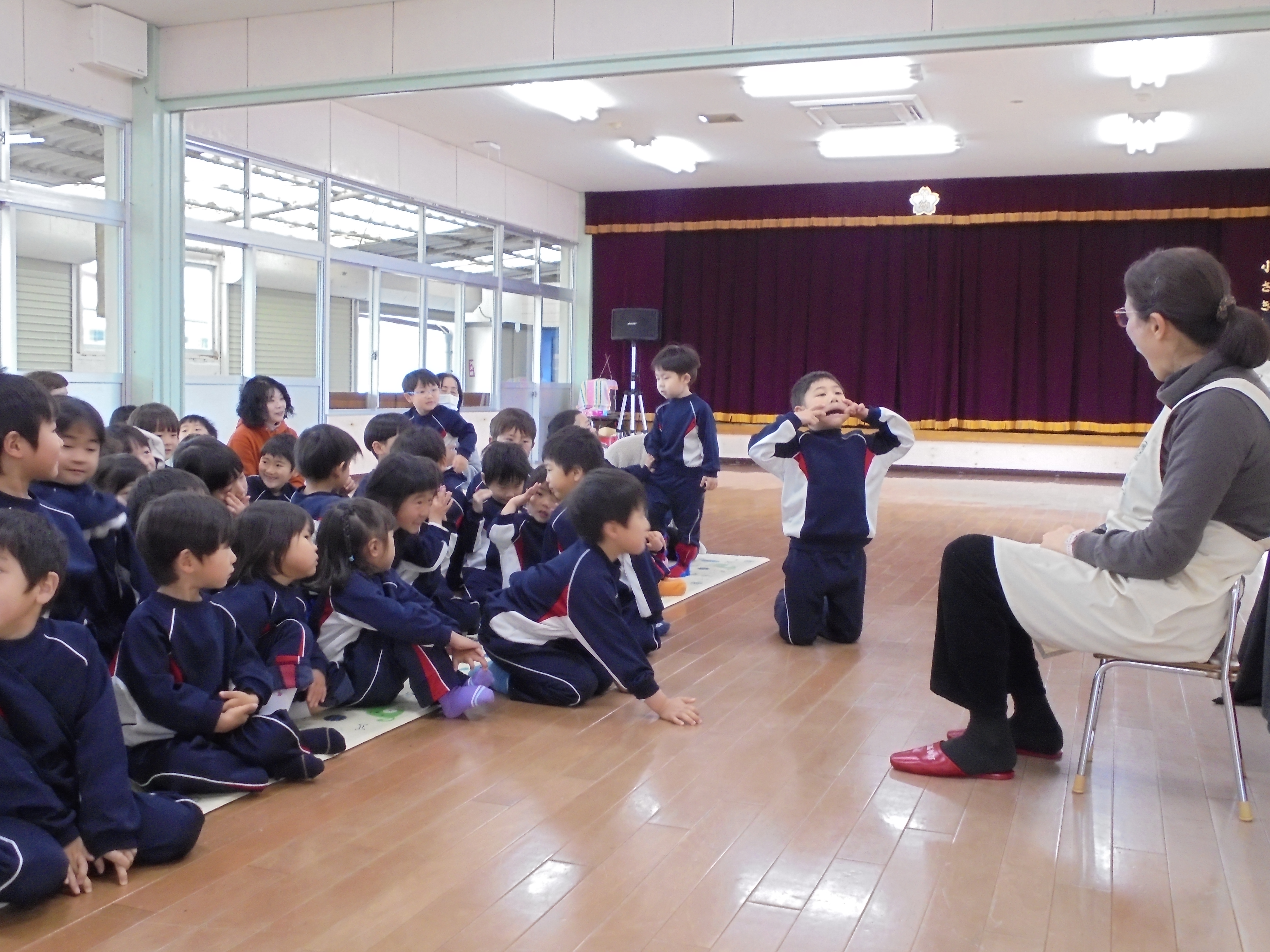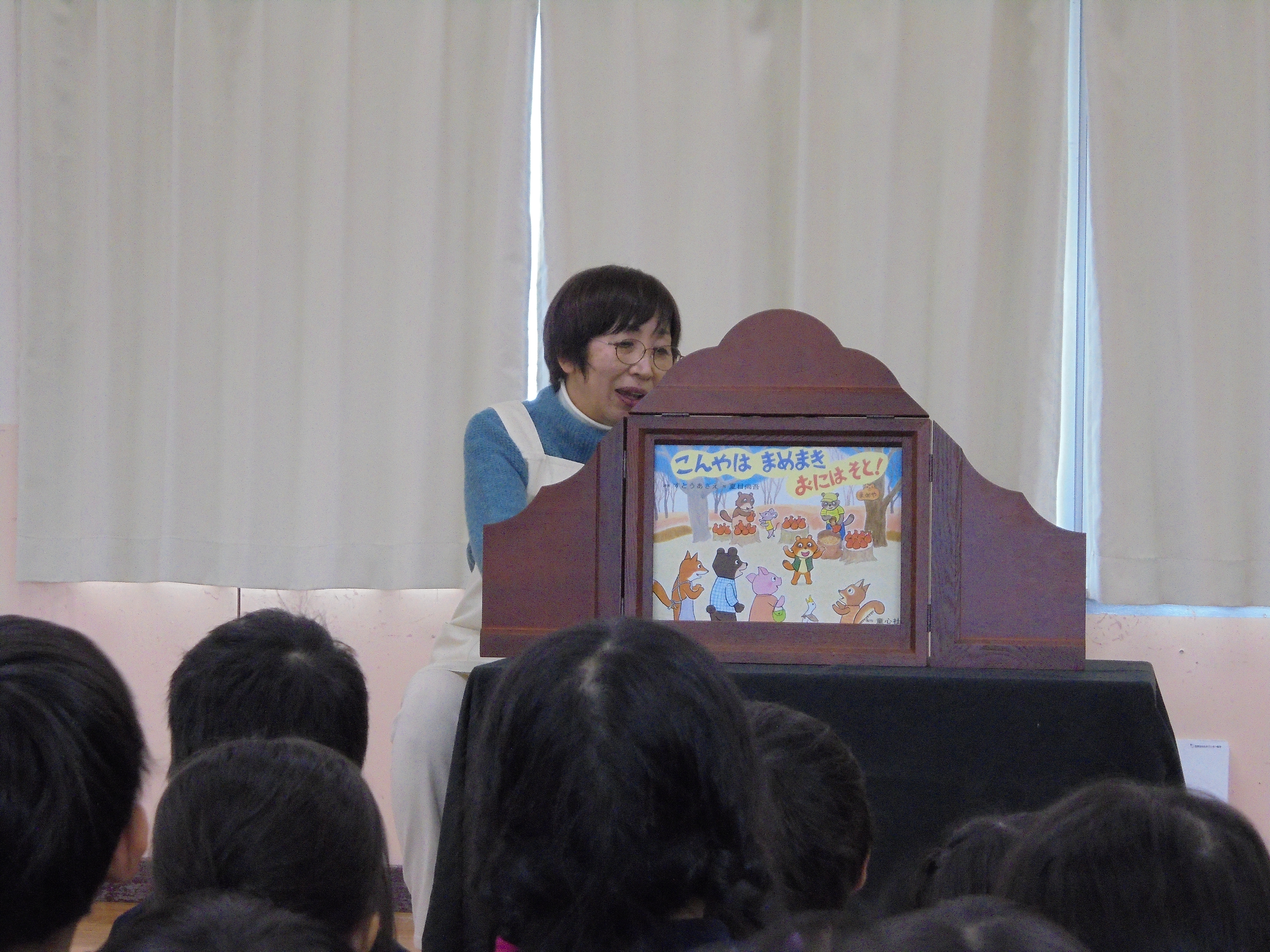 ボランティアの皆様が来園され、「お話の部屋」が行われました。今月は「十二支のかぞえうた」や「ももたろう」、「こんやは豆まき、鬼はそと」など、季節を感じるお話の読み聞かせをしていただきました。また、「でんでらりゅうば」の手遊びや「にらめっこ」もあり、子どもたちは笑顔いっぱいで楽しい時間を過ごしました。ボランティアの皆様、心あたたまるひとときをありがとうございました。