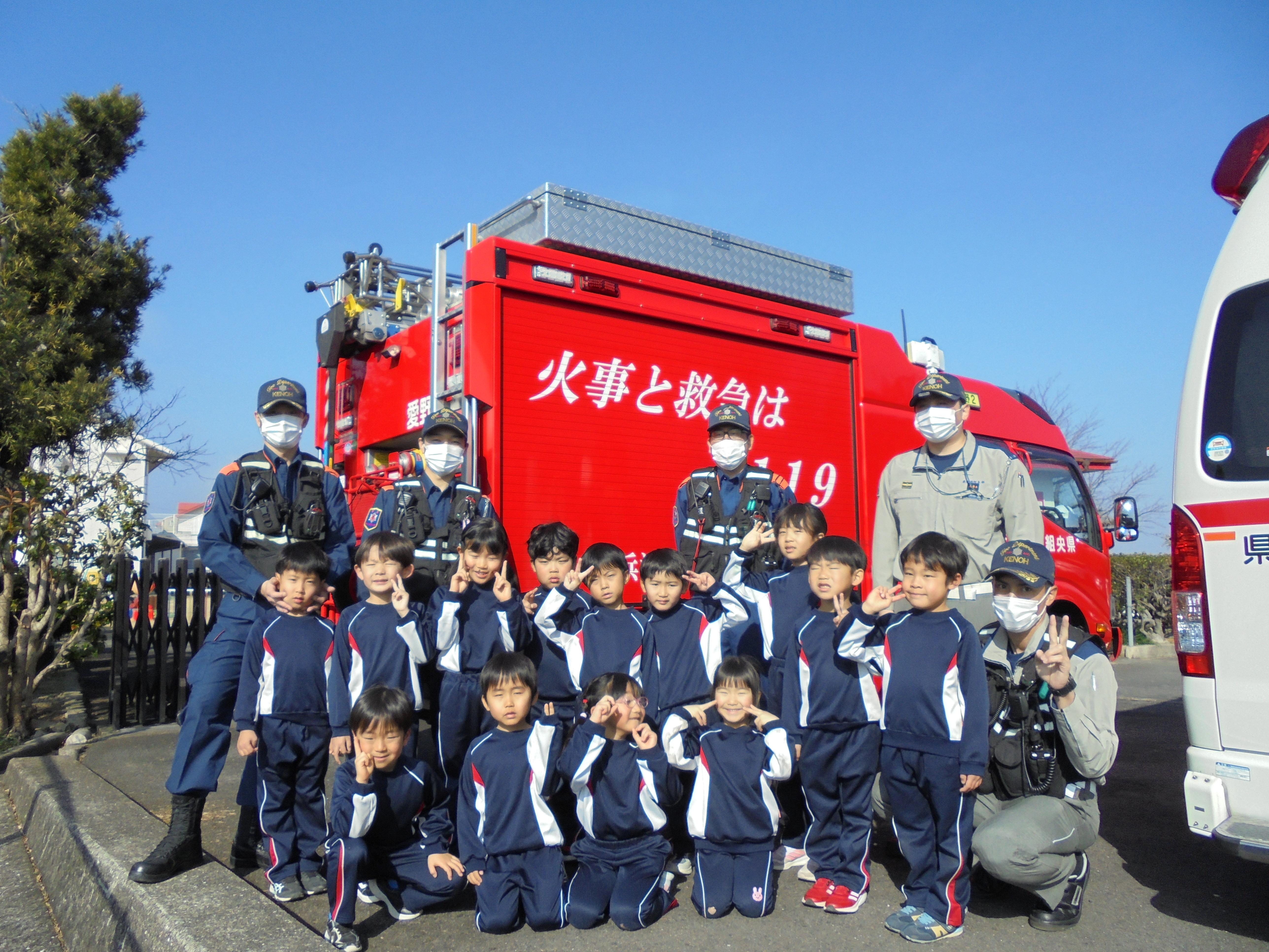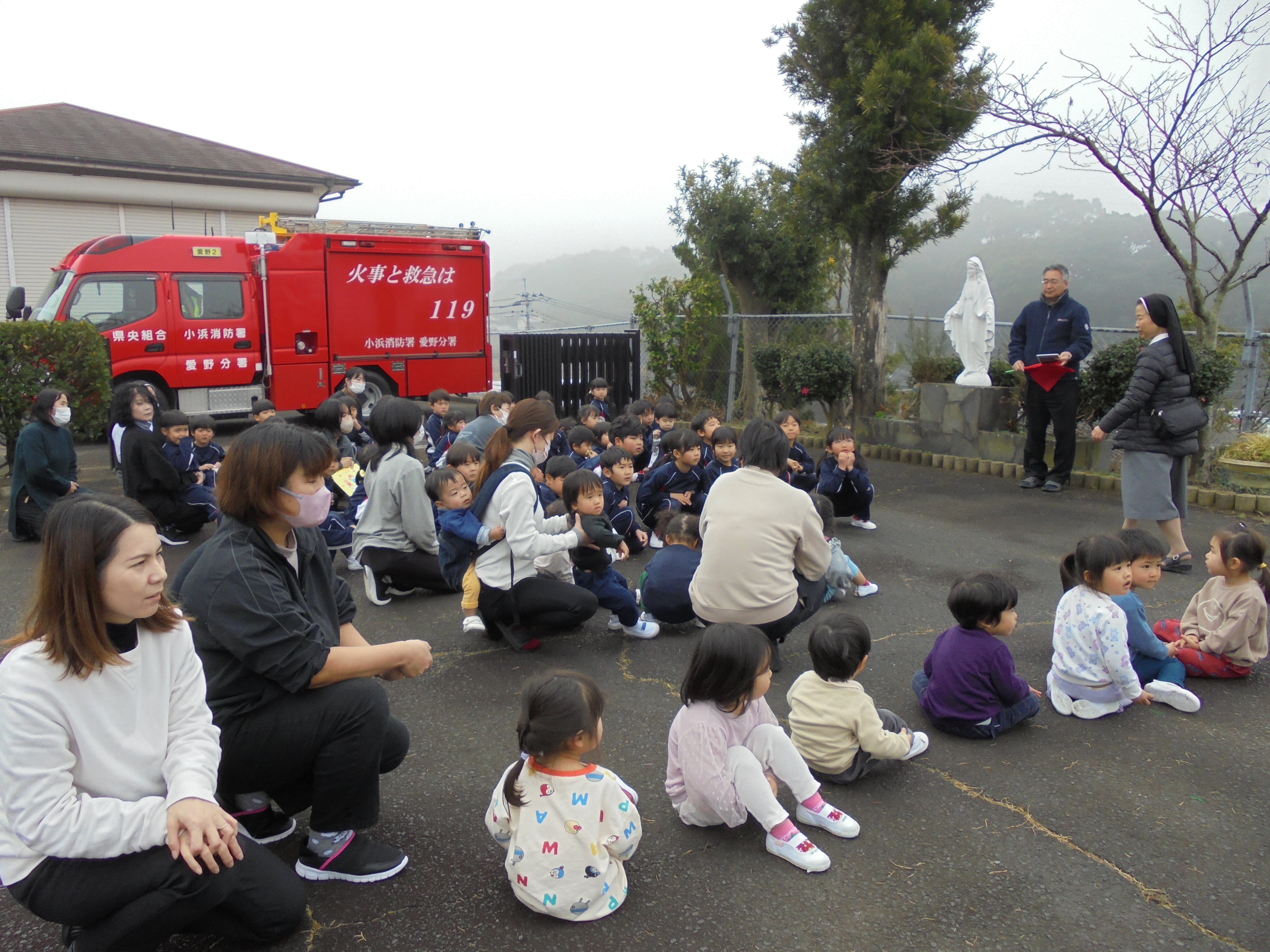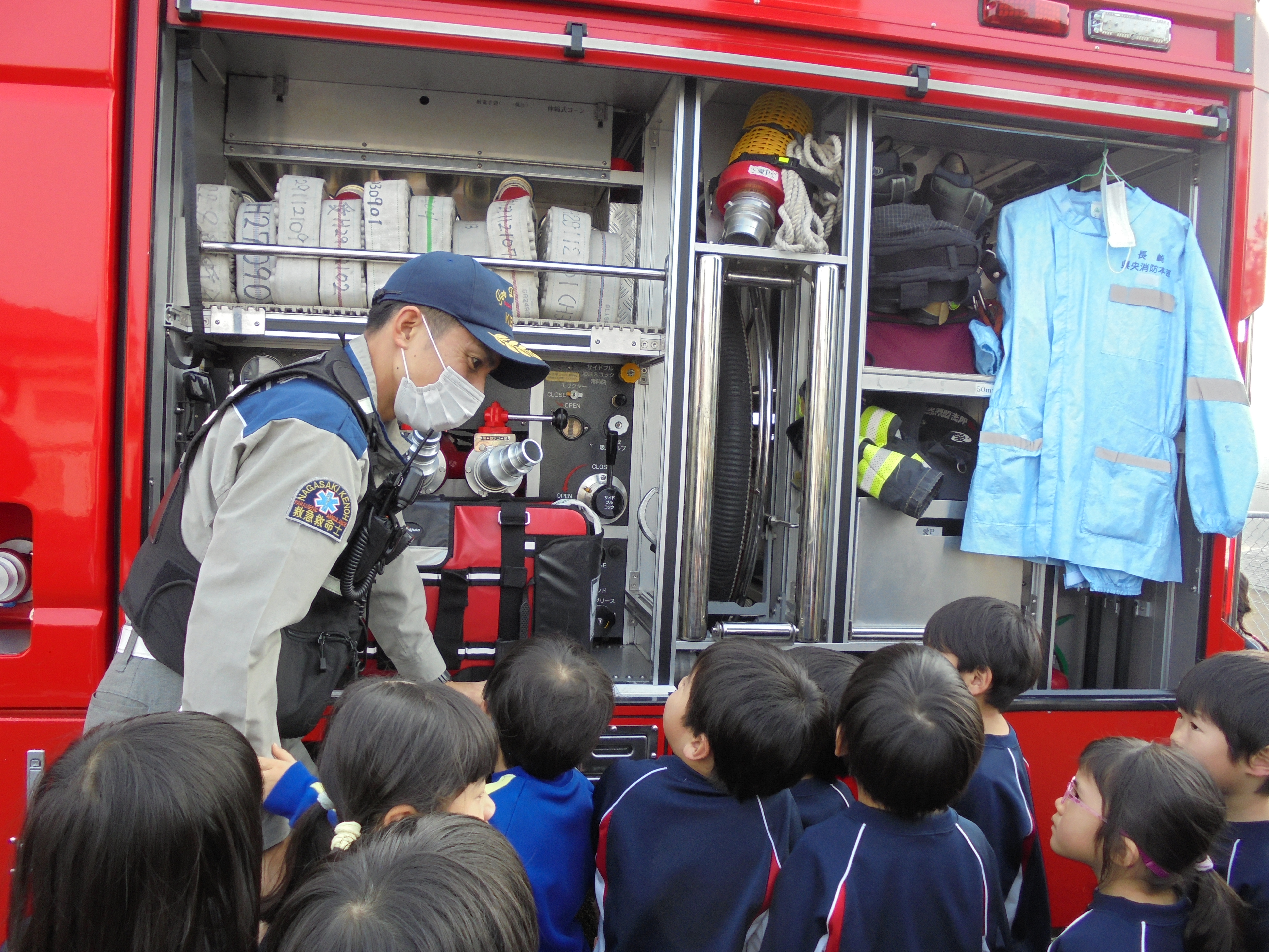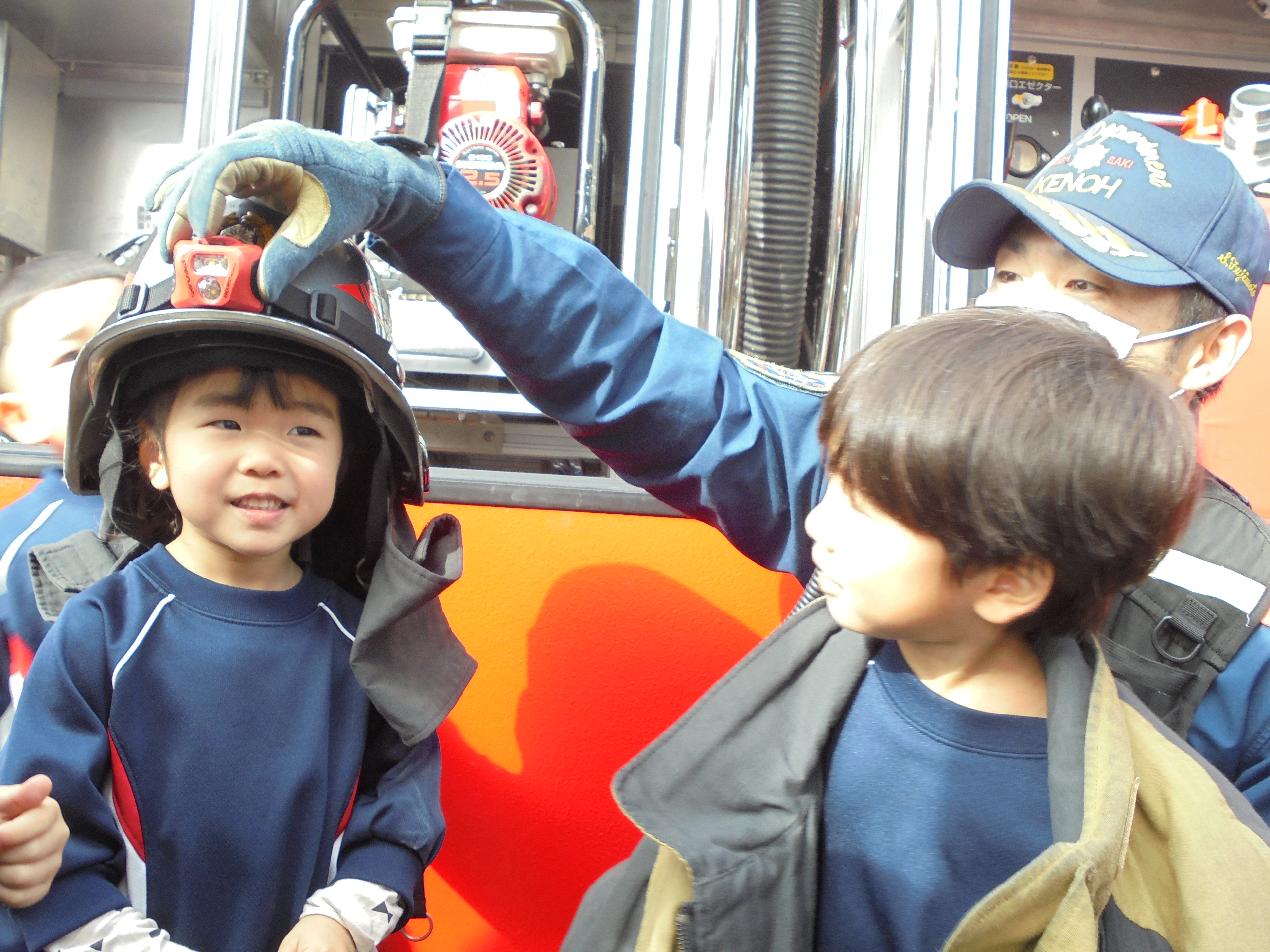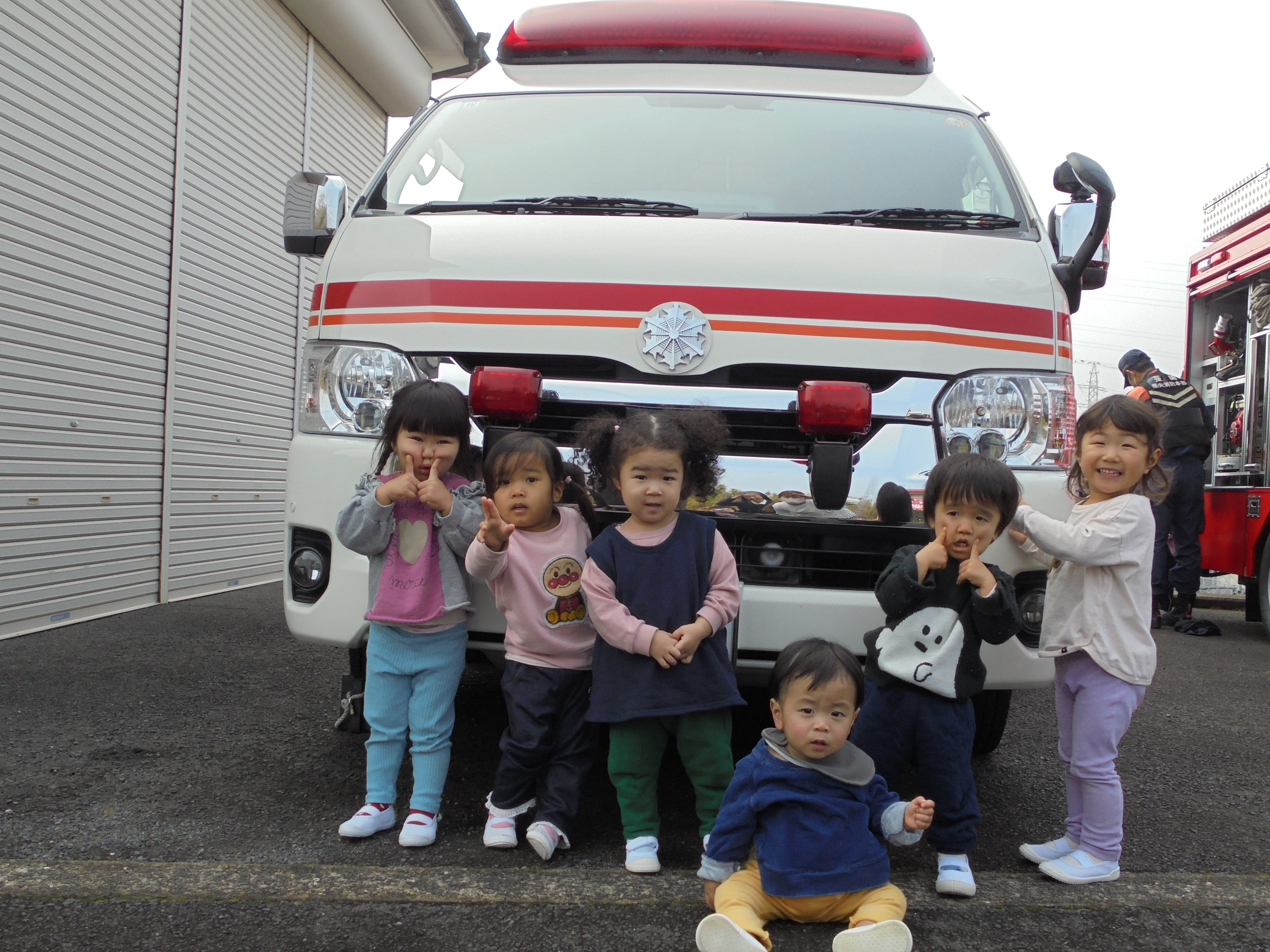 今日は消防署の立ち合いの元、消防訓練が行われました。子どもたちは火災発生の放送後、職員の誘導に従い落ち着いた様子で避難することができました。避難訓練後は職員の消火訓練を行い、消防車や救急車を見学させていただきました。「消防士さんはどんなお仕事をするんですか?」「車についているコレは何ですか?」など、疑問に思ったことを質問し、真剣に話を聞いていました。消防署の皆さん、ありがとうございました。