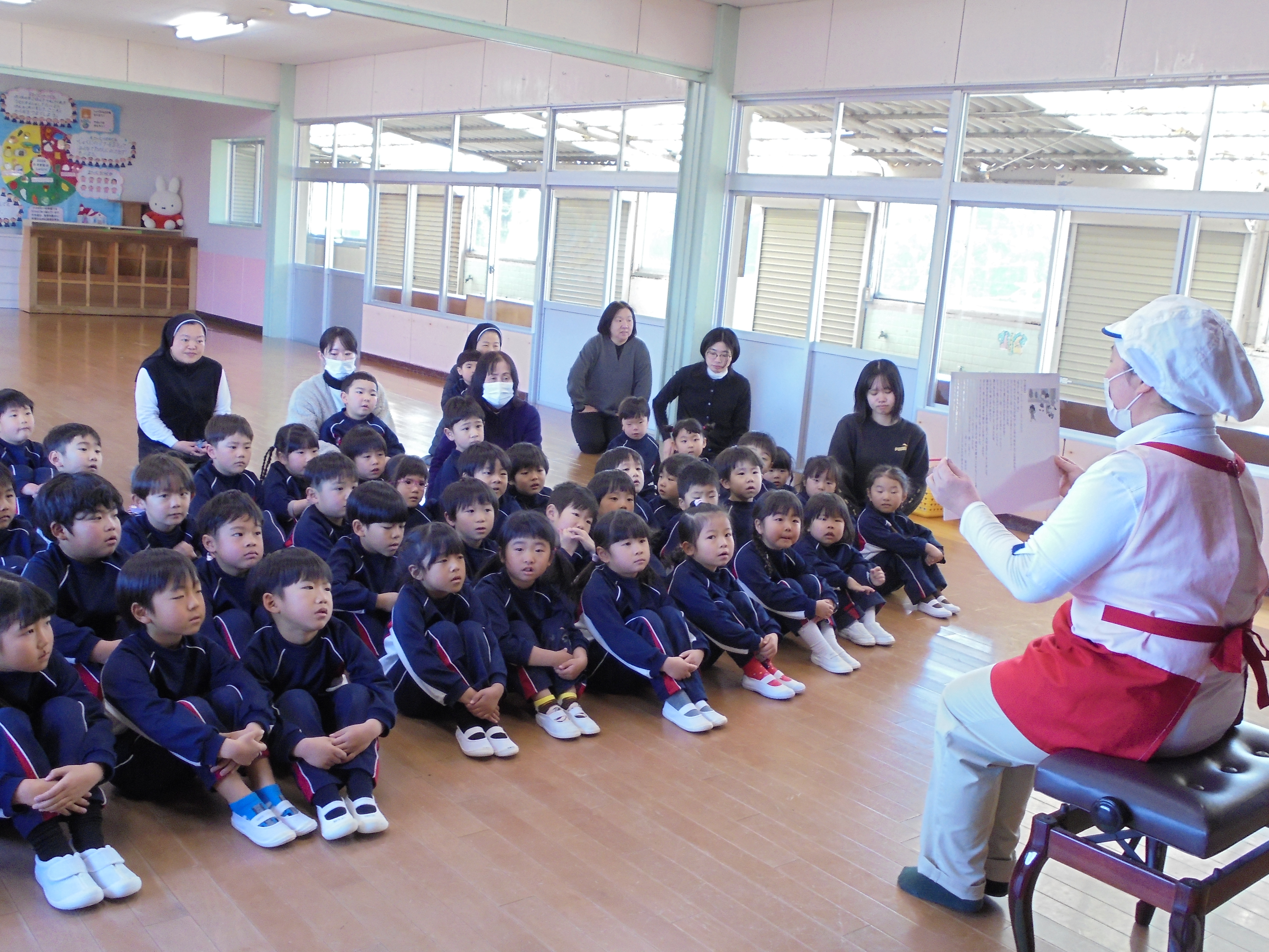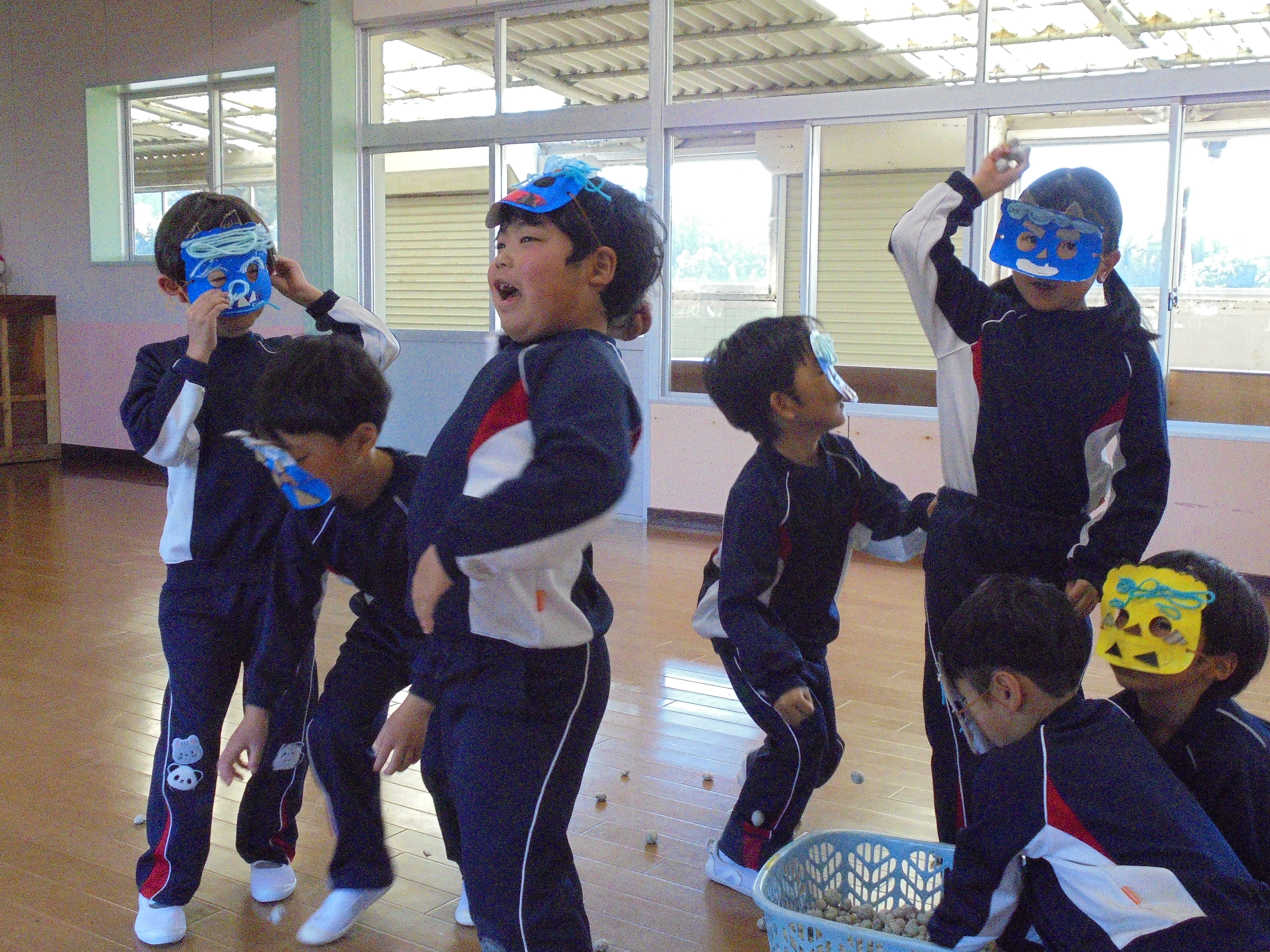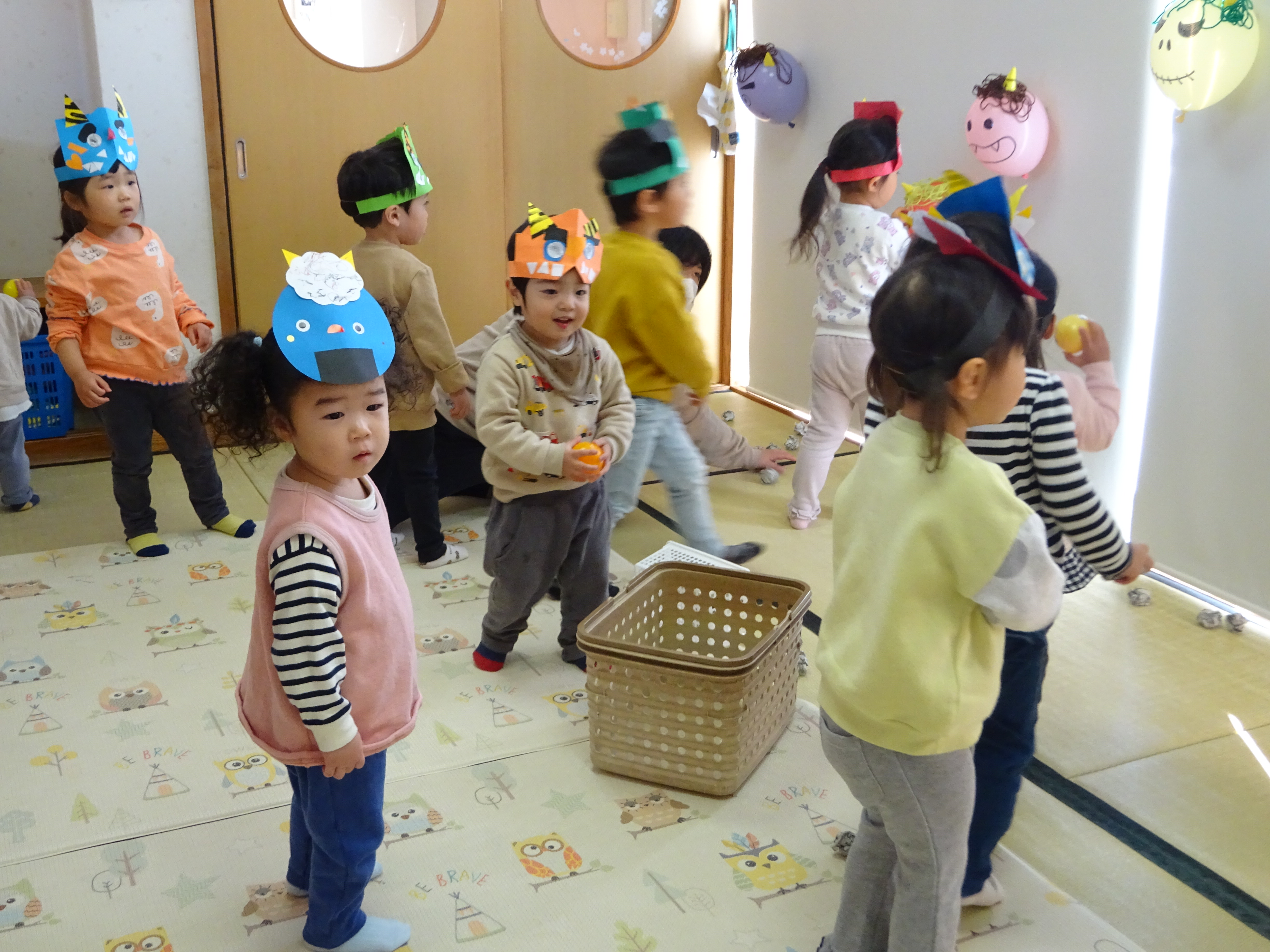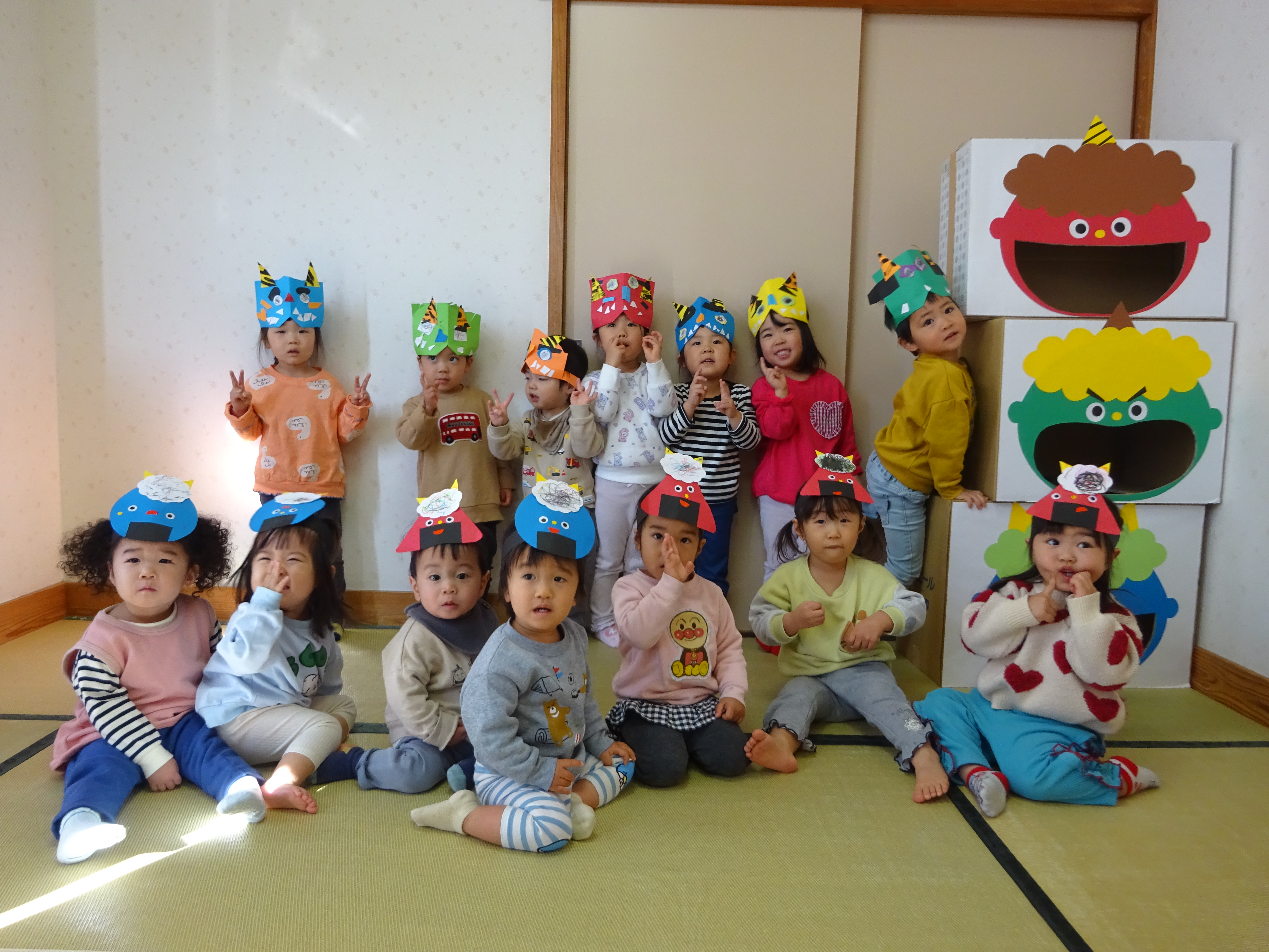 今日は以上児と未満児それぞれで豆まきを楽しみました。以上児はホールに集まり、いつも美味しい給食を作って下さる久保先生より節分の紙芝居をしていただきました。「心の中にはどんな鬼がいるかな?」と自分たちで考え、大きな鬼のイラストに向けて新聞紙で作った豆を投げて楽しみました。未満児はすみれ組に集まり、豆まきのお話をして風船や段ボールの鬼に豆まきをしました。以上児も未満児も「鬼は~外!福は~内!」と元気な声で豆をまき、心の中の鬼を追い出すことができました♪